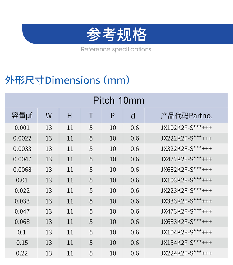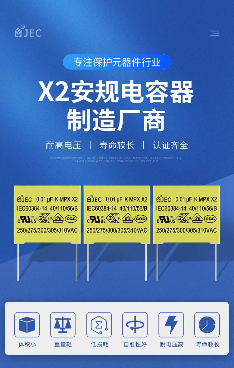 - JEC安规X2电容275V 0.01uF 10nF 10000pF 103K 脚距10mm